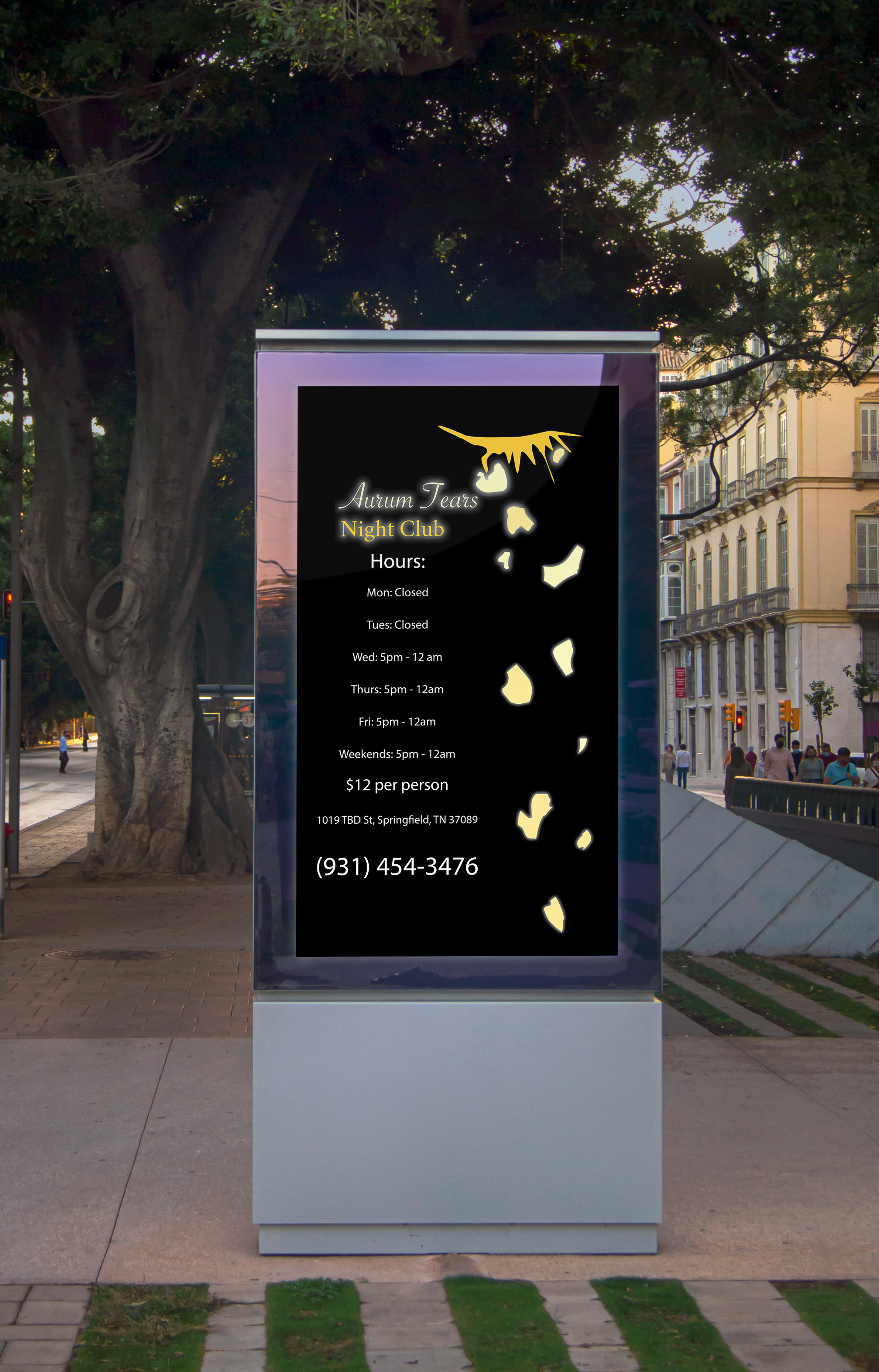A night club logo inspired by Gustave Klimt, & his famous portrait of Adele Bloch-Bauer I. I decided to explore the night club concept with a fancy dinner aspect to it. Wanting to expand on Aurum Tears identity. Aurum means gold in latin.